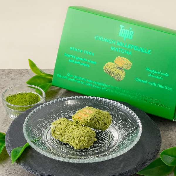 ホワイトチョコレートに香り高い宇治抹茶を合わせてパイと重ね、ザクザク食感の抹茶味のフィアンティーヌで一つ一つ丁寧に包み込みました。
