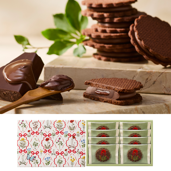 深みのあるチョコレートと、なめらかなガナッシュ、やさしい口どけのクリームがひとつとなった3層ショコラを香り豊かなココアクッキーでサンドしました。