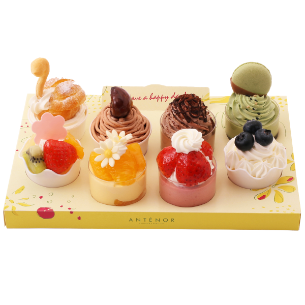 苺、抹茶、ショコラ、モンブラン、レアチーズなど8つの味わいをプティサイズで詰め合わせ。小さな幸せがたくさん詰まっています。