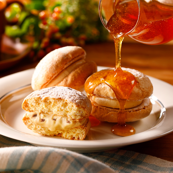 やさしいメープルの香りが広がる生地に、カナダ・ケベック州でつくられたメープルシュガーを使った、なめらかなクリームをサンド。やわらかな甘みと香ばしさが織りなす、京王限定販売のメープルブッセ。