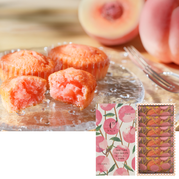 樹の上でゆっくり完熟した山梨県産の桃を、シーキューブ独自の「後入れしっとり製法」で香り高い、ジューシーな焼き菓子に。
