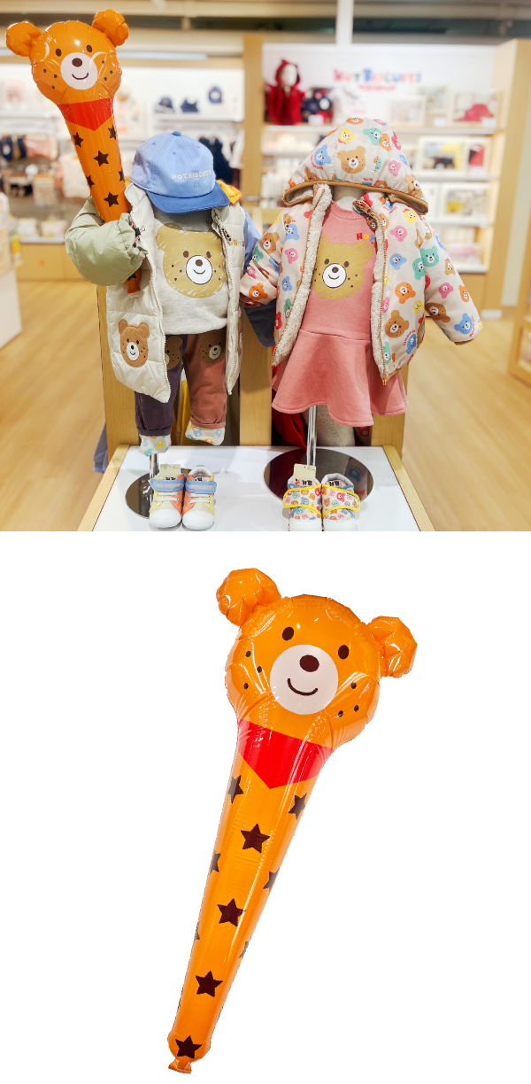 期間中、ミキハウス ホットビスケッツのセール全品と一般全品を合わせて税込11,000円以上お買い上げの方に「ホットビスケッツベアスティック(風船)」をプレゼント。