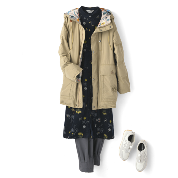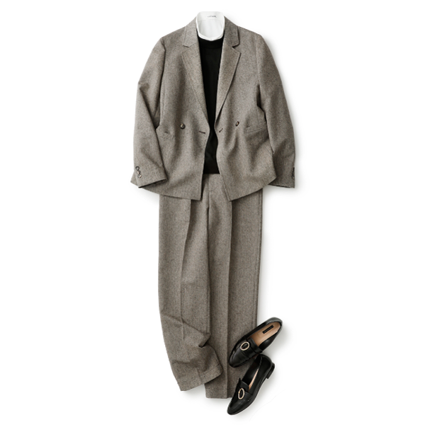 高密度の二重織リバー素材のコートに、吸湿性と暖かさに優れたウォームリザーブシリーズのパンツを合わせて。パンプスはバブーシュとしても履ける2WAY仕様です。