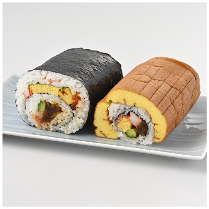 𠮷川水産特製の具沢山な太巻と人気の伊達太巻のハーフ&ハーフのセット。伊達太巻はお子様にも喜ばれそう!