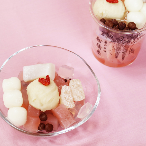 苺寒天にミルク餡を重ね、人気の白玉を添えました。白蜜をかけて、やわらかな甘みをお楽しみください。