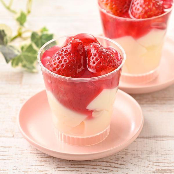 杏仁豆腐に苺、ぷるぷるのジュレを合わせた可愛らしいカップデザート。