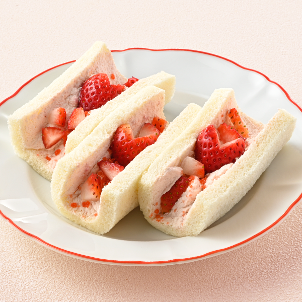 甘酸っぱいイチゴ味のクリームにハートの苺をトッピング!旬の苺を沢山使ったフルーツサンドです。