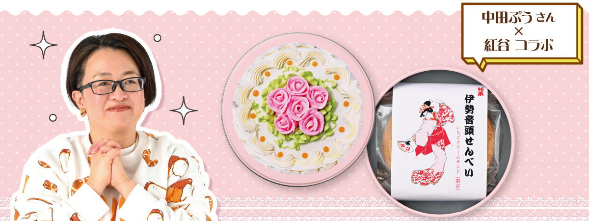 紅谷さんのかわいいバターデコレーションのケーキを缶にしました。中にはいちごの伊勢音頭せんべいが入っています。
