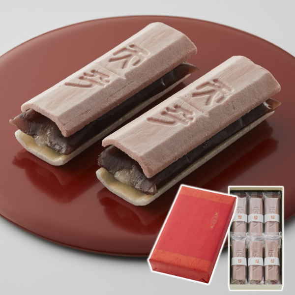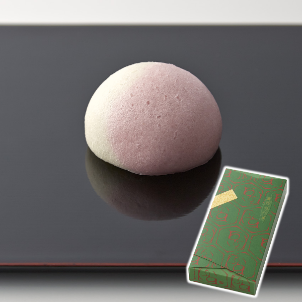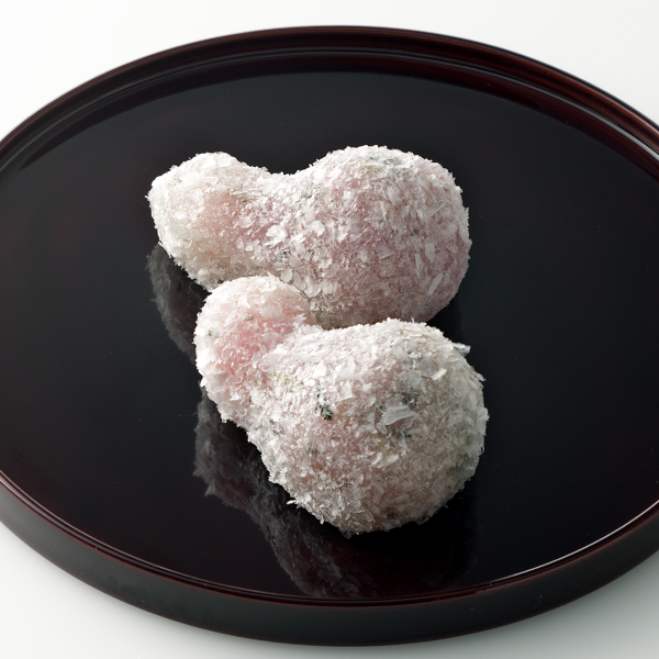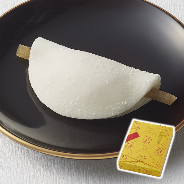 白く円い羽二重餅に赤米を使った菱餅を重ね、みそ餡と押し鮎にみたてた牛蒡を包みました。米どころ近江で収穫された滋賀羽二重糯を使い作り上げた、平安の昔から伝わる祝菓子です。