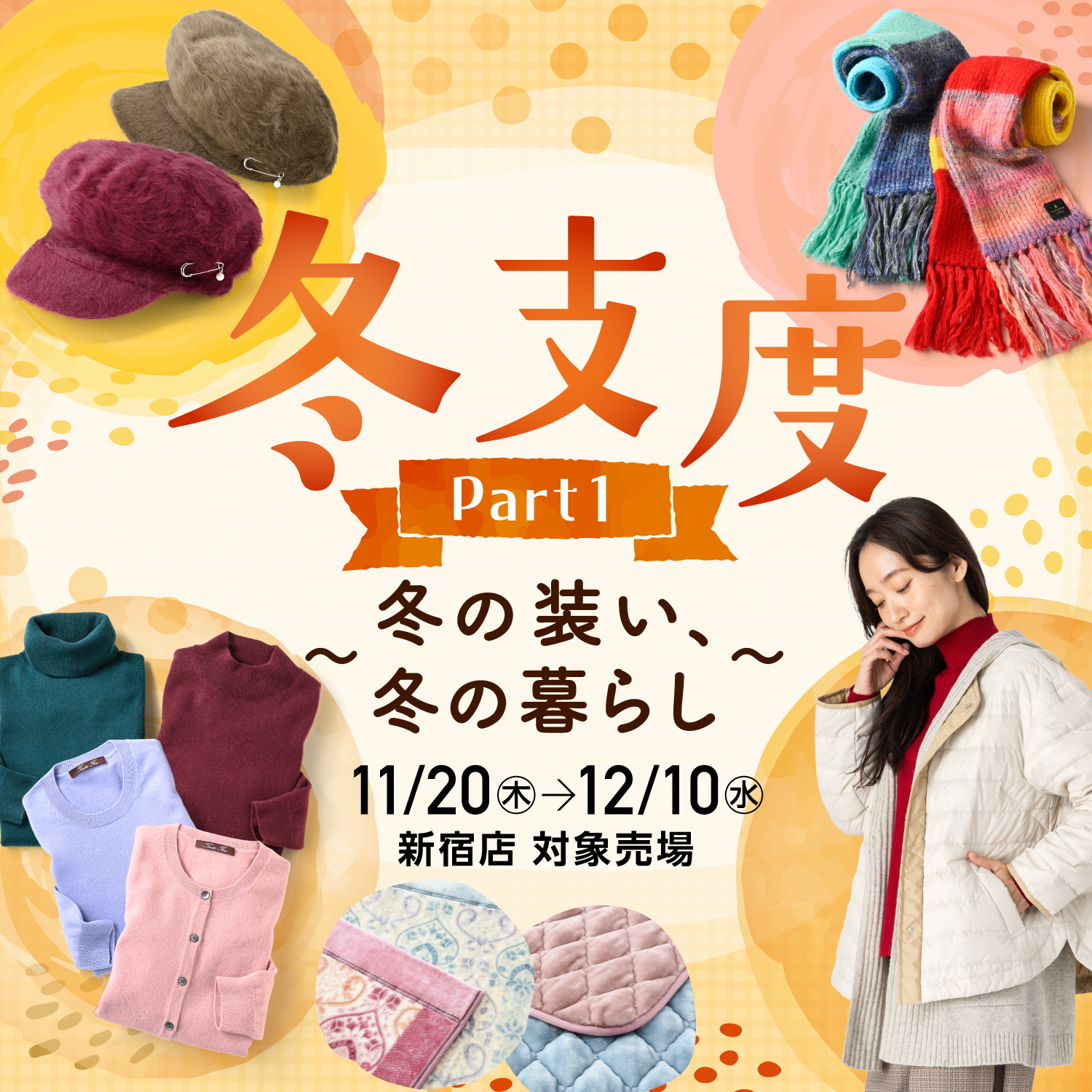 ●1階 婦人洋品売場かさばらずに持ち歩けるプチスカーフで気軽に防寒対策。首元でひと結びしたり、頭に巻いたり、ひし形だからアレンジしやすいのもポイントです。