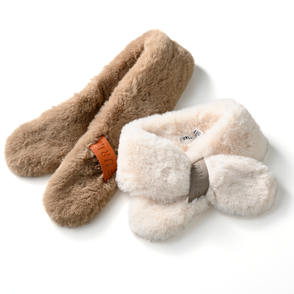ふわふわのエコファーながらコンパクトなサイズ感。FURLAロゴをあしらったカラフルなベルトループがアクセントになっています。