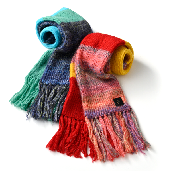 カラフルなロングタイプのマフラーだから、巻き方も自由自在です。おしゃれなミラノ巻きや、ぐるぐる巻いたボリュームのあるスタイリングも素敵!
