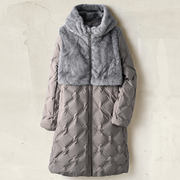 キルティング風のダウンコートに、暖かみのあるエコファーを組み合わせた異素材コンビ。
