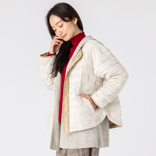 二層仕立てながらも軽さが魅力のダウン。冬のはじまりにちょうどいい薄さと着丈、縦と横のキルティングをミックスしたライトコートです。