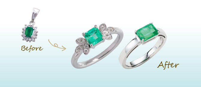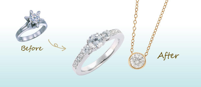 ジュエリーから外した宝石を新しい枠にセットし、新たなジュエリーに作り替えます。当店では多種多様のオリジナルデザインの枠を取り揃えています。お手持ちの宝石やお好みのスタイルに合わせて最適なリフォームをご提案いたします。