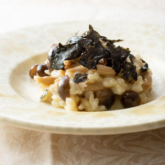 旬のシメジを使用した、味わい深いリゾットです。パルミジャーノと海苔がシメジを引き立てます。