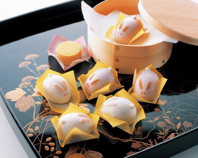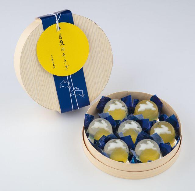 月(黄身しぐれ)を白いうさぎ(芋餡)と、赤いうさぎ(半小豆餡)が囲んでいる、味も見た目も楽しめる薯蕷饅頭セットです。