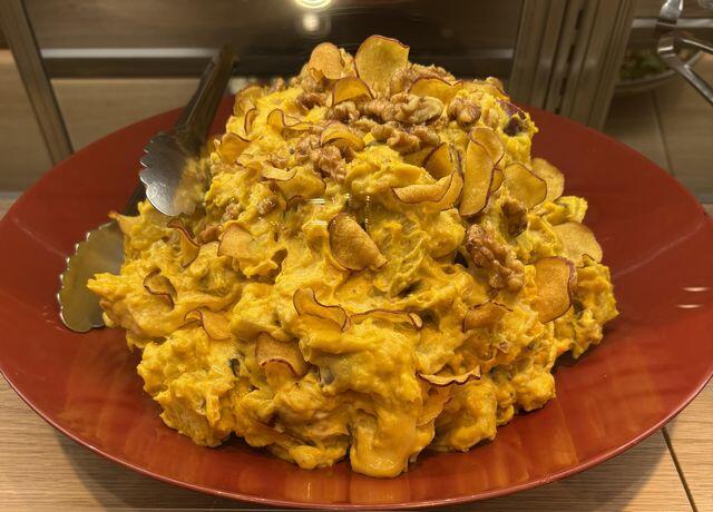 秋の味覚の定番、さつまいもと南瓜を、クリームチーズやくるみとあわせた秋サラダです。