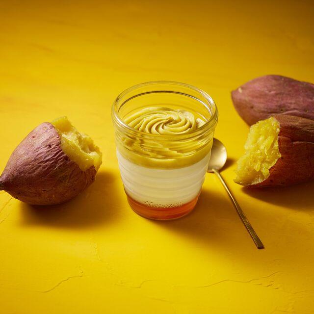 紅はるかの甘みを凝縮したとろりと甘い芋蜜ソースに濃厚な甘みの紅はるかの味わいを引き立たせた、口どけなめらかなお芋のプリンを合わせ、紅はるかのペーストを使用した濃厚なお芋のクリームを重ねました。3層すべてに紅はるかを使用したお芋尽くし、三位一体の美味しさをお楽しみください。