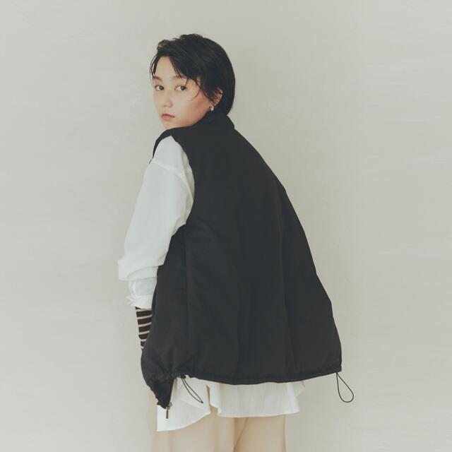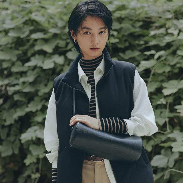 襟裏部分やポケット口などリブ使いをポイントにしたオーバーサイズのベスト。ウール調のポリエステルレーヨン素材でウォーム感がありワンランク上の見え方に仕上げています。表のステッチワークをなくしスッキリした表情に。