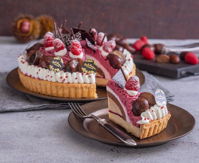 クリームのチーズタルトに酸味の効いたカシスクリームとジャム・まろやかな甘さのマロンクリームを重ね、ラズベリーと栗の渋皮煮を飾りました。