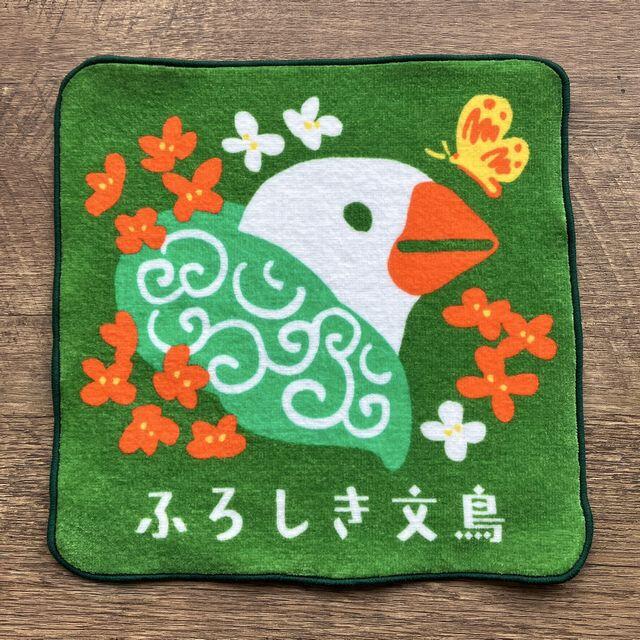 ふろしき文鳥のイラストとキンモクセイ柄を組み合わせた、レトロな雰囲気のミニタオル。普段使いや持ち歩きに便利なサイズです。