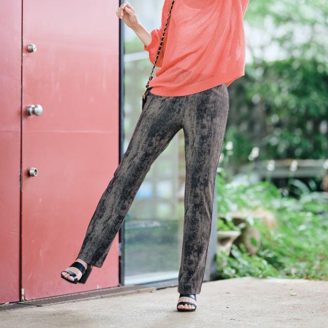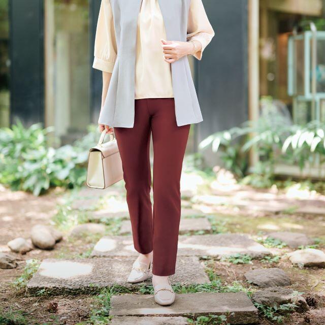 そんなコンセプトで生まれた一本は、表面の自然な凹凸が独特の風合いを生み出すオックス調の生地、上品なカラー、トレンド感のあるスリムストレートシルエットで女性の「美しさ」と「楽」を両立。 体のラインを拾いすぎず、軽快なはき心地、すっきり美脚見えを叶えてくれるのでカジュアルでもきちんと感を出したいときにぴったりです。 前側にシルエットが崩れにくいダーツポケット、後は大型の貼りポケットを施しており小物の持ち運びに便利です。