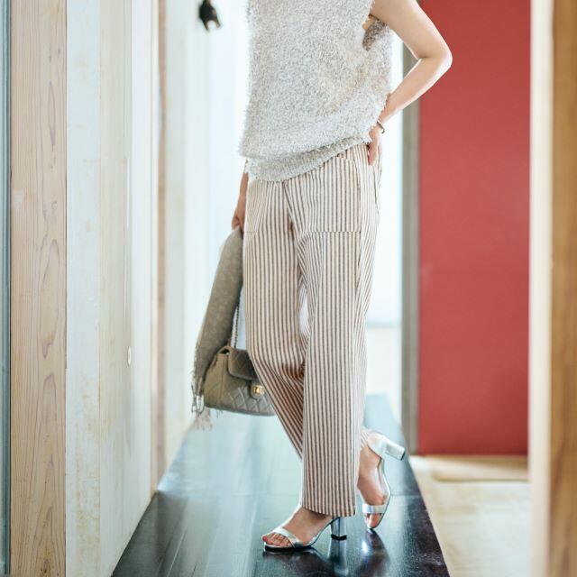 綿100%トリコット編みのヒッコリーストライプベイカーパンツは、後ろウエスト部分にはギャザーをあしらい、ヒップラインを拾わない上品なシルエットに。 前後に施した大きな四角いポケットがデザインのアクセントとなって、カジュアルになりすぎない大人のパンツスタイルを演出します。男女兼用なので、パートナーとのお揃いコーデも素敵。 (男性がご着用いただく場合の参考サイズは、普段のサイズよりワンサイズ上がおすすめです。)