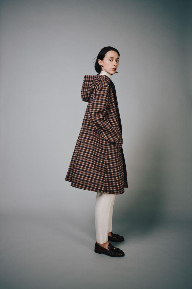 クラブチェックカラーへ英国らしいレッドのペンを効かせたオリジナルのリバー素材。チェックと無地の異なる雰囲気をお楽しみいただけるリバーシブルコート。