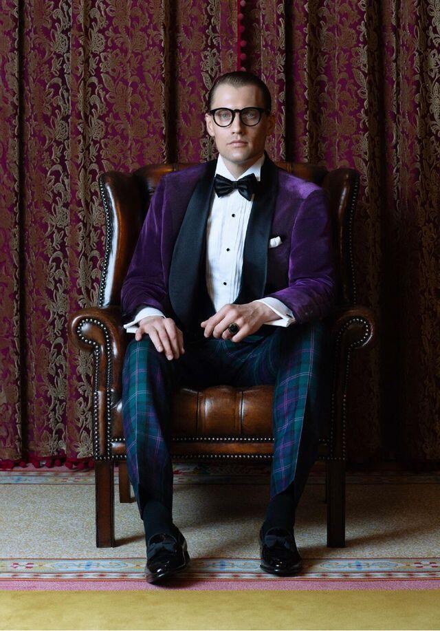 深く濃密なアメジスト色の服地と、端正なシルエットが、今宵の主人公に究極のエレガンスを纏わせる。