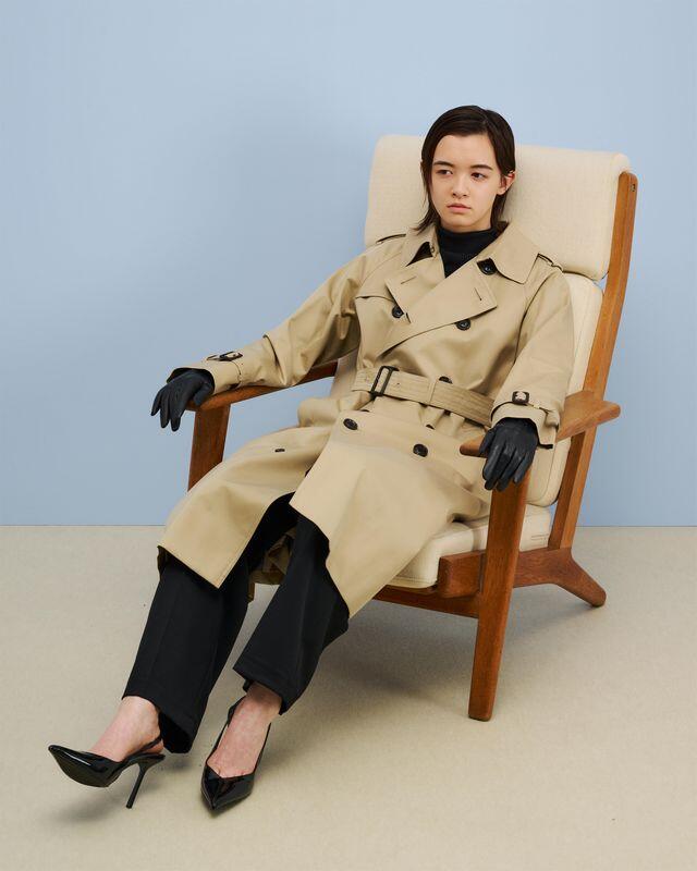 クラシックかつモダンなシルエットバランスの追求。上質なギャバジン生地の立体的なドレープにこだわり、長めの着丈で自然なAラインのシルエットで、身頃はクラシックな2パネル構成です。
