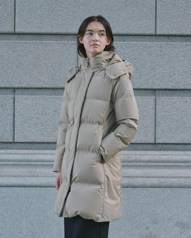 冬の装いにアクティブさと気品を添えるロング丈のダウンコートです。ダウンの切り替えは熱圧着によるシームレス仕様を採用し、フロントは隠しドット仕様で統一しました。雨風から身体を守るとともに、見た目にもすっきりとしたデザインに仕上げています。