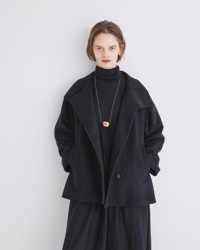 Aライン・ドロップショルダーのショートコートです。着丈は38サイズで65cm丈に設定しています。衿は高さのあるスタンドカラーを採用し、開いて着用するとピーコートのように着ることができる2WAY仕様です。