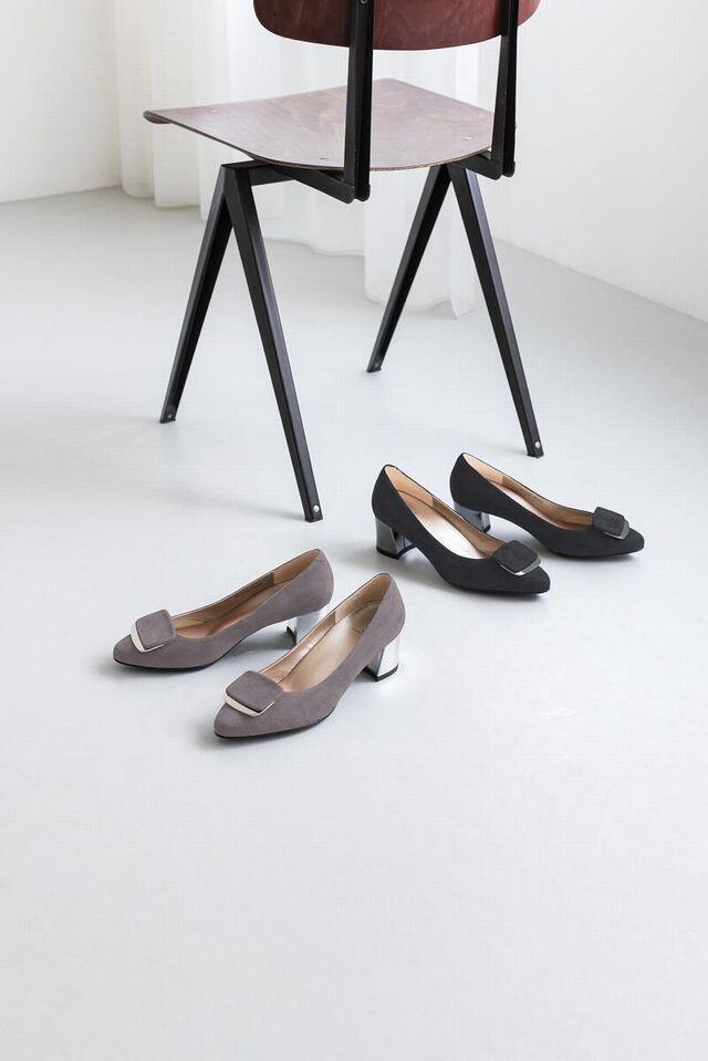 カジュアルスタイルを好まれる方やヒールを履きなれない方でも挑戦しやすい太めヒール。羊革スエードとメタリックなヒールのコントラストが美しくコーディネートのポイントに。