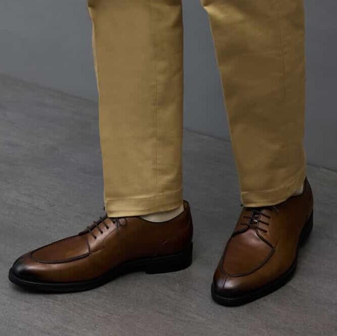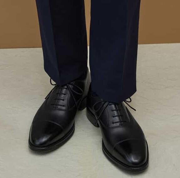 つま先に一直線のラインが入った内羽根ストレートチップ、セミスクエアシルエットのドレスシューズ。防水透湿性に優れるゴアテックスファブリクスをライニングに使用しています。シャドースプレーのツヤを強調し、高級感を演出しています。