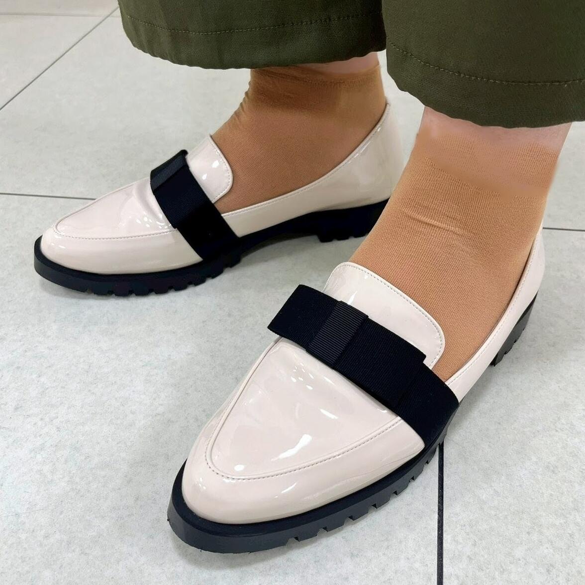 リボンモチーフが女性らしさをさりげなく引き立たせてくれます。足元がすっきりと綺麗に見えるようにこだわったシルエットでどのコーデも馴染みます。素足はもちろん、シースルーソックスなどと合わせて雰囲気を変えるのもオススメです。