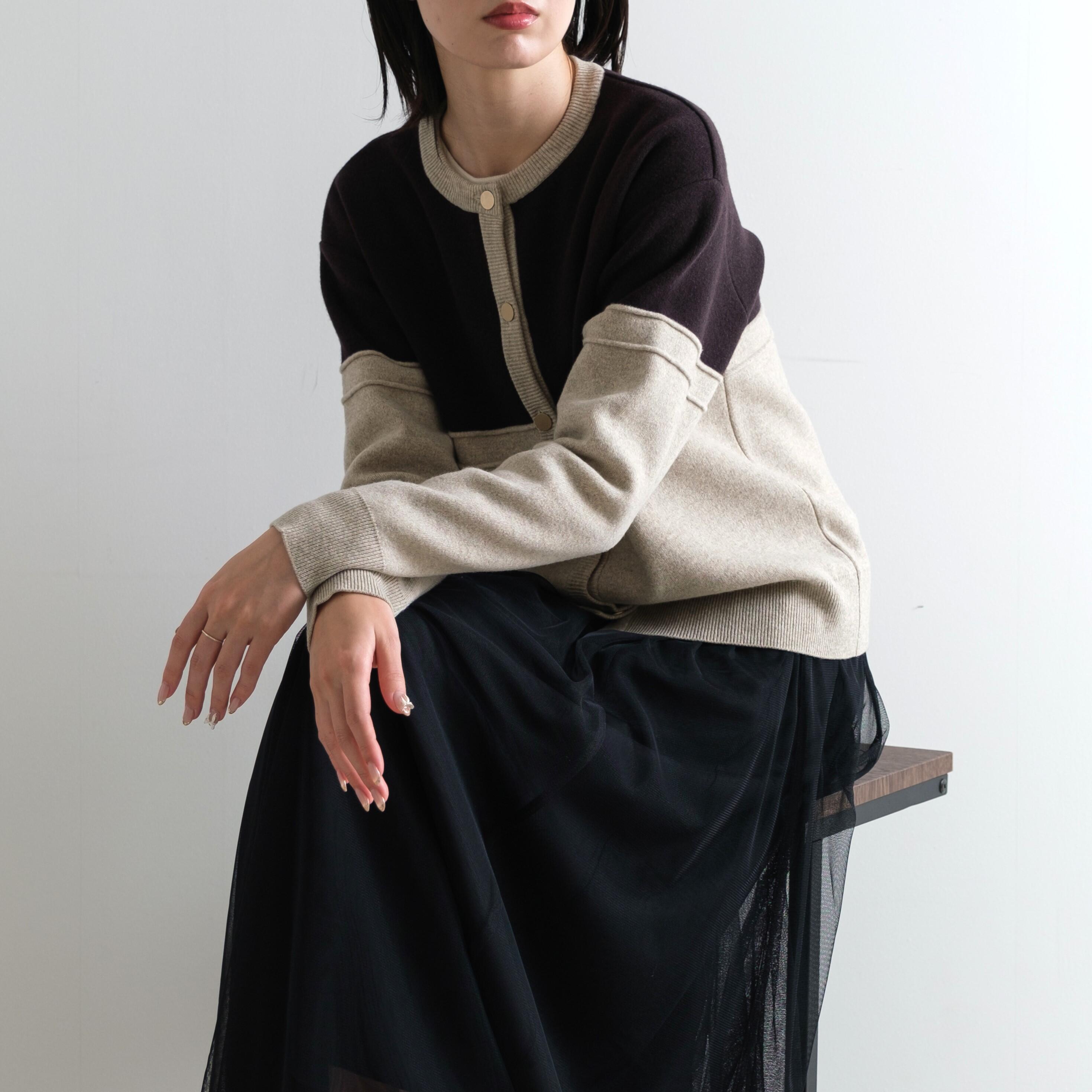 遊び心とインパクトのある配色で1枚着でも存在感がでます。ピンタックライン・目面・軽さに至るまで、ニットメーカーと試行錯誤を重ね、細部まで丁寧に仕上げました。