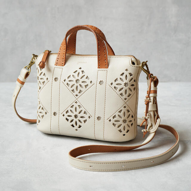 花模様をダイヤ型に配置し、ミシンワークを加え、華やかな限定のカットワークバッグをご用意しました。