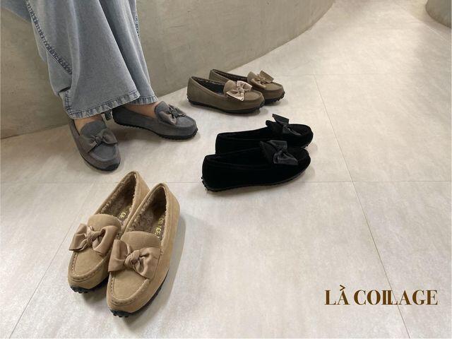 変形リボンがチャーミングな牛革のモカシンシューズ。あたたかみのあるモコモコの生地を裏に使用し、暖かさと履き心地を備え、真冬もお履きいただけます。カジュアル過ぎず、程良い女性らしさを表現。オリジナルのドライビング底はグリップ性に優れ、安定感もあります。