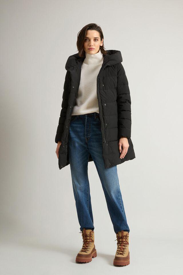 細めのピッチでキルトステッチを全面に施しシャープに仕上げています。ヒップ全体が隠れる丈で保温性もアップ。ロフト感のあるフランス産ダックダウンを充填しており、表地には光沢を抑えたピーチスキンのような質感の非常にソフトな素材を採用しています。