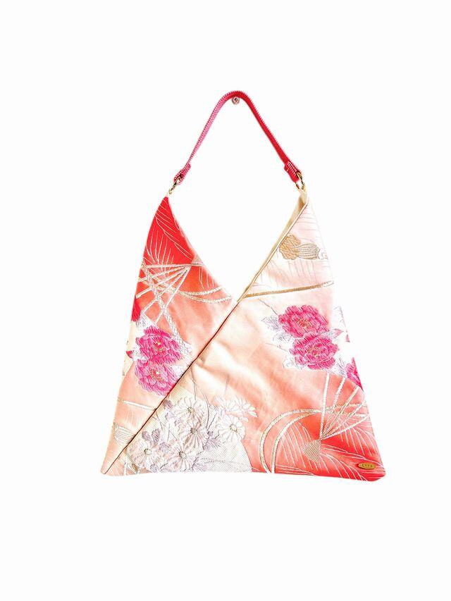 帯と持ち手は帯締めをリメイクしたバッグです。形はあずま袋をモチーフにしている一点物のバッグです。帯の美しい生地を再利用することで、エコな取り組みにも貢献しています。存在感抜群な大きさで、たっぷりと収納できるのが嬉しいポイントです。