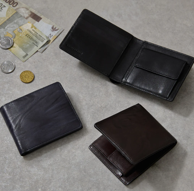 水面の揺らぎを映したレザーを仕立てた、コンパクトな二つ折り財布。絞り加工によって生まれたレザーの凹凸に染めを施した、奥行きのある革の濃淡と風合いが、さりげない個性をプラスします。十分な容量を持ち合わせながら、ボトムのポケットにも収まるサイズ感が魅力。使いやすいベーシックな色展開で、ギフトにぴったりです。