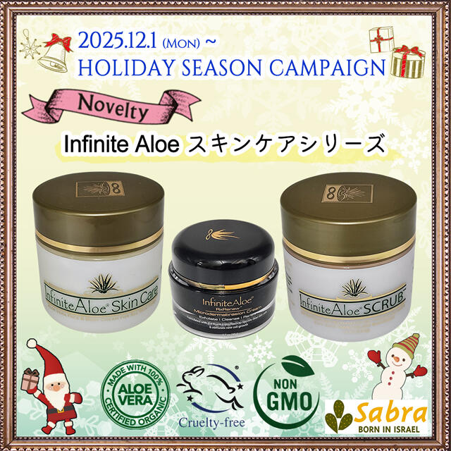 期間中、対象商品を税込22,000円以上のお買い上げのお客様に、オーガニックアロエベラを配合した『Infinite Aloe スキンケアシリーズ(3種類)』の中からお好きなものを1点プレゼントいたします。