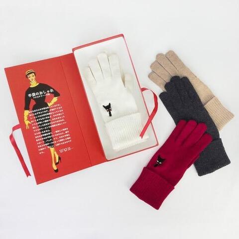 左手には中原淳一がアップリケの柄として描いた大人気の黒猫、右手にはJNのロゴが繊細な刺繍でデザインされています。カフスは折り返し仕様でロンググローブとして着用していただくこともできます。淳一の絵と言葉が美しい特製のオリジナルボックス入りです。