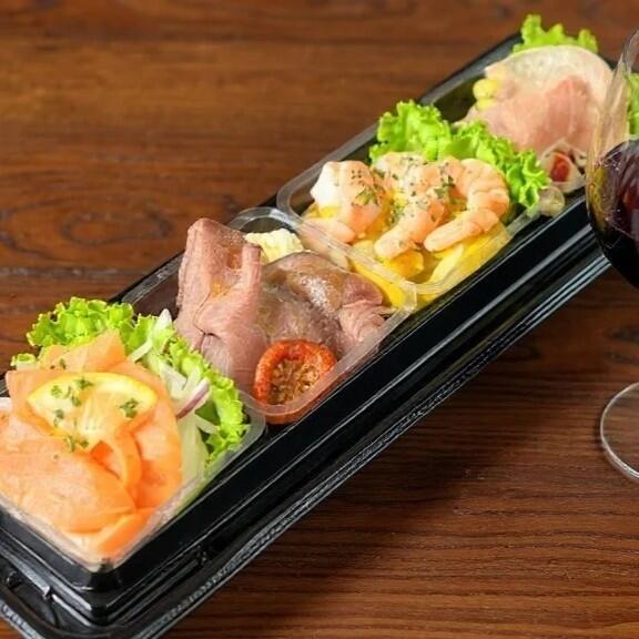 生ハム、ローストビーフ、シーフードなど豪華な食材に、人気のサラダも盛り合わせたうれしいセットです。