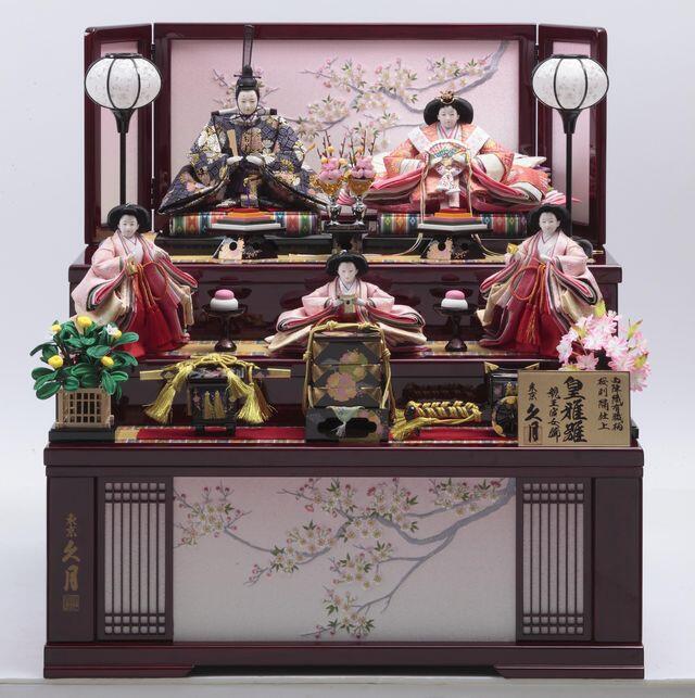 ピンクの刺繍屏風と飾り台が優しく感じられる人気の収納五人飾。