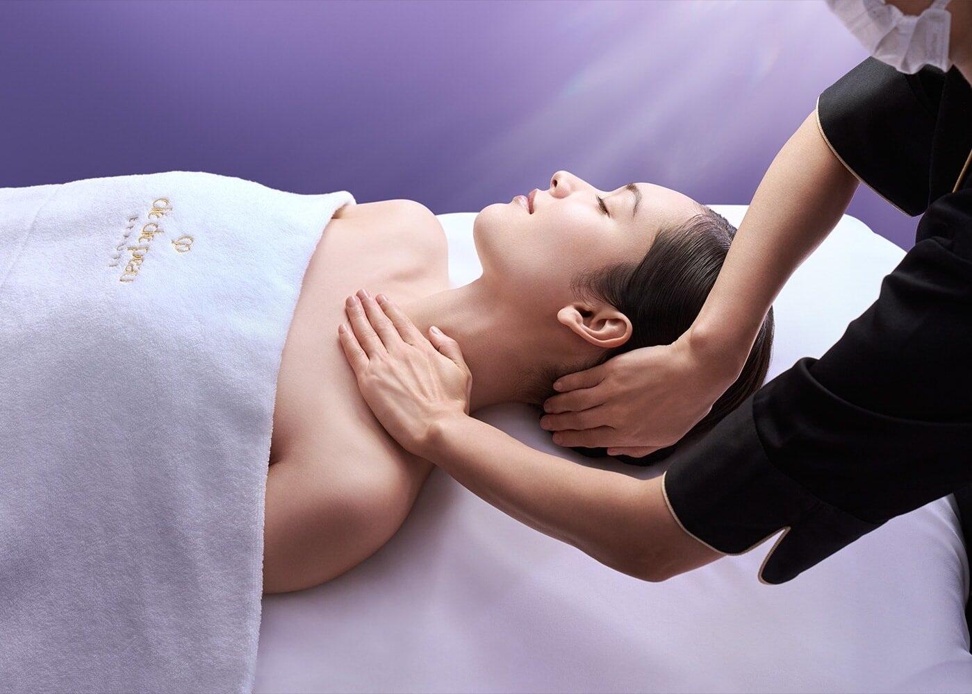 高機能スキンケアと独自機器、洗練のテクニックの融合が叶える特別なトリートメントです。デコルテまでの広範囲に働きかけ、リンパの流れに沿った手技により360℃どこから見ても凛とした聡明な顔立ちへ導きます。