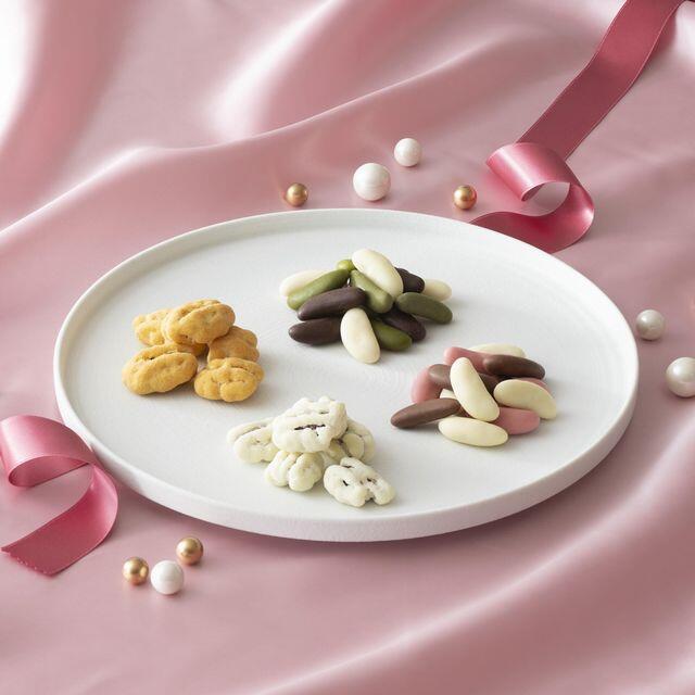 百人一首の恋歌に想いを寄せたチョコあられ「想ひそめし」(スイート・ビター)と、香ばしいナッツをまろやかなショコラで包んだ「ペカンナッツショコラ」(和三盆・キャラメル)。異なる4つの味が織りなす甘やかな調べをお楽しみいただけます。