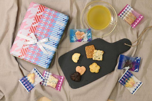 カラフルで目を引くレトロな缶にチーズやカレー、チョコ掛けなど甘辛どちらも楽しめる詰合せです。召し上がった後に小物入れとしてもお使いいただきたい1缶です。