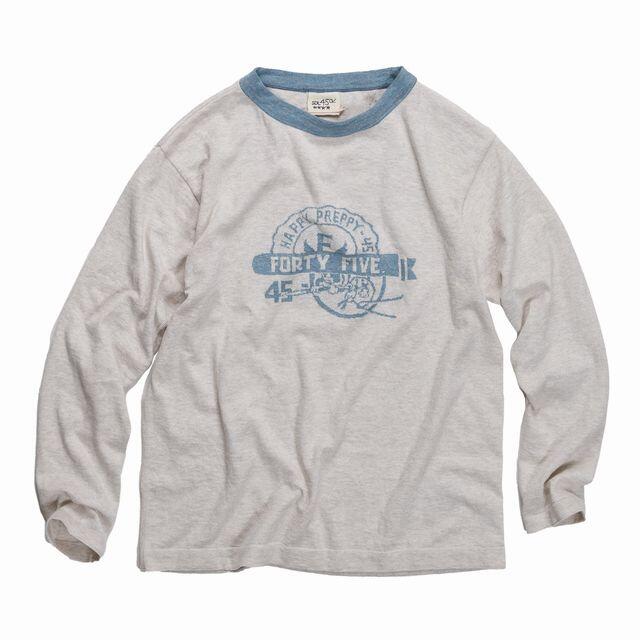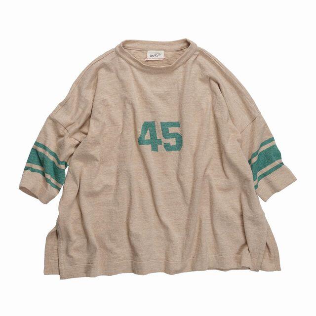 Tシャツのように気軽に着られるのに、ニットならではのやわらかな表情が魅力です。ロゴ部分はジャガードで編み出しました。肌触りも抜群です。